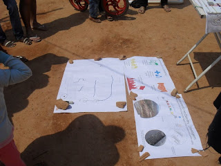 O grupo Diálogos apresentou cartazes e uma maquete que ilustravam as questões referentes aos problemas de esgoto, lixo e drenagem na Comunidade. Os cartazes utilizados na reunião ajudaram a ilustrar a discussão, mas não foram essenciais, já a maquete foi importante para auxiliar os moradores no entendimento do funcionamento da rede de esgoto. O mapa georreferenciado, resultado do levantamentos com GPS, foi apresentado na reunião e os moradores ajudaram a equipe na discussão sobre direcionamento da rede de esgoto e na marcação de pontos da Copasa não identificados.